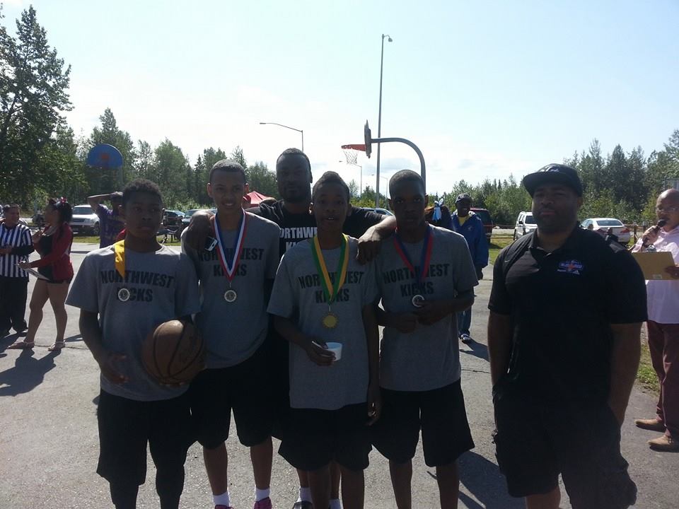 Members of the Alaska Gold basketball program continued to show why they are some of the best athletes in Alaska by taking winning many categories at the 2014 Mt. View Lions Park’s 3 on 3 Basketball Tournament. Team Hustle competed in the High School division was comprised of 2015 players Desmond Johnson, Duol Yat, Marquis White and Class of 2020 Daishen Nix.
